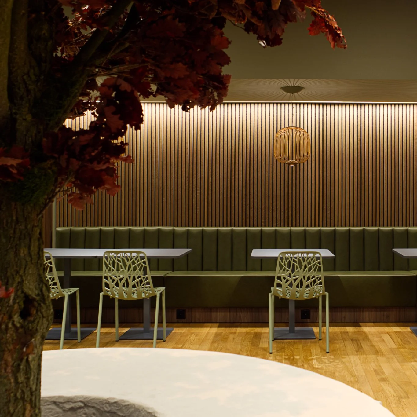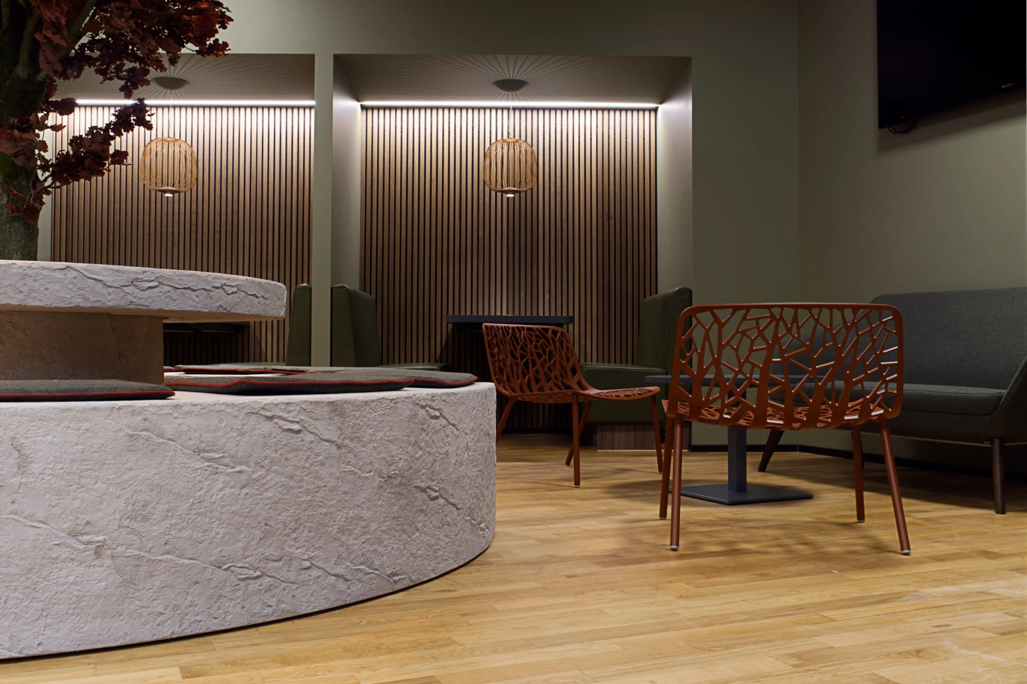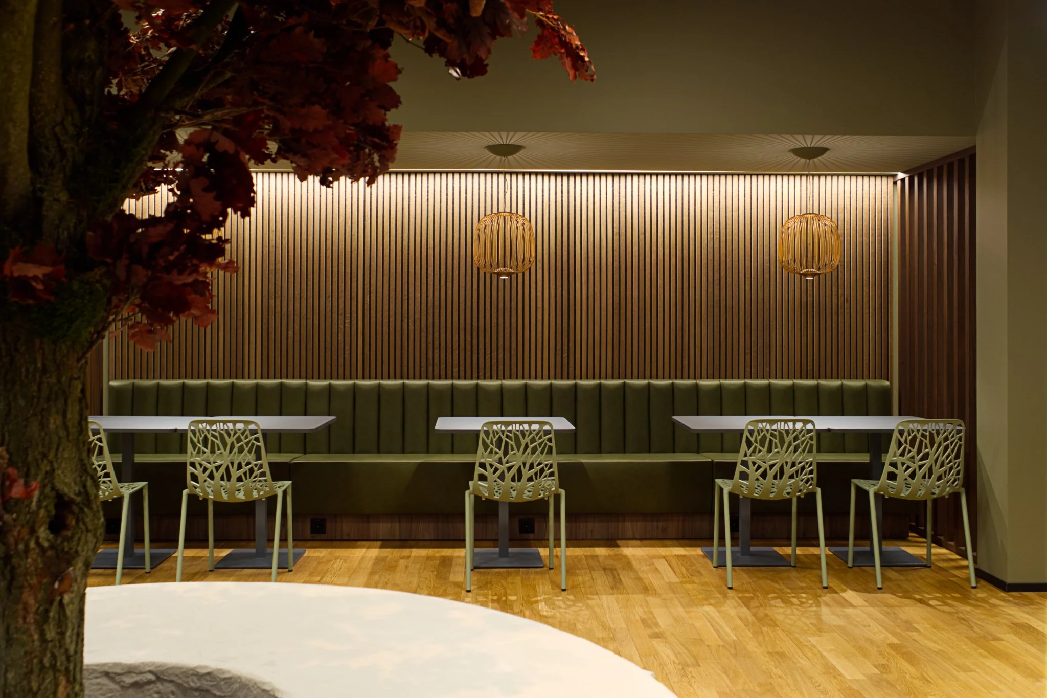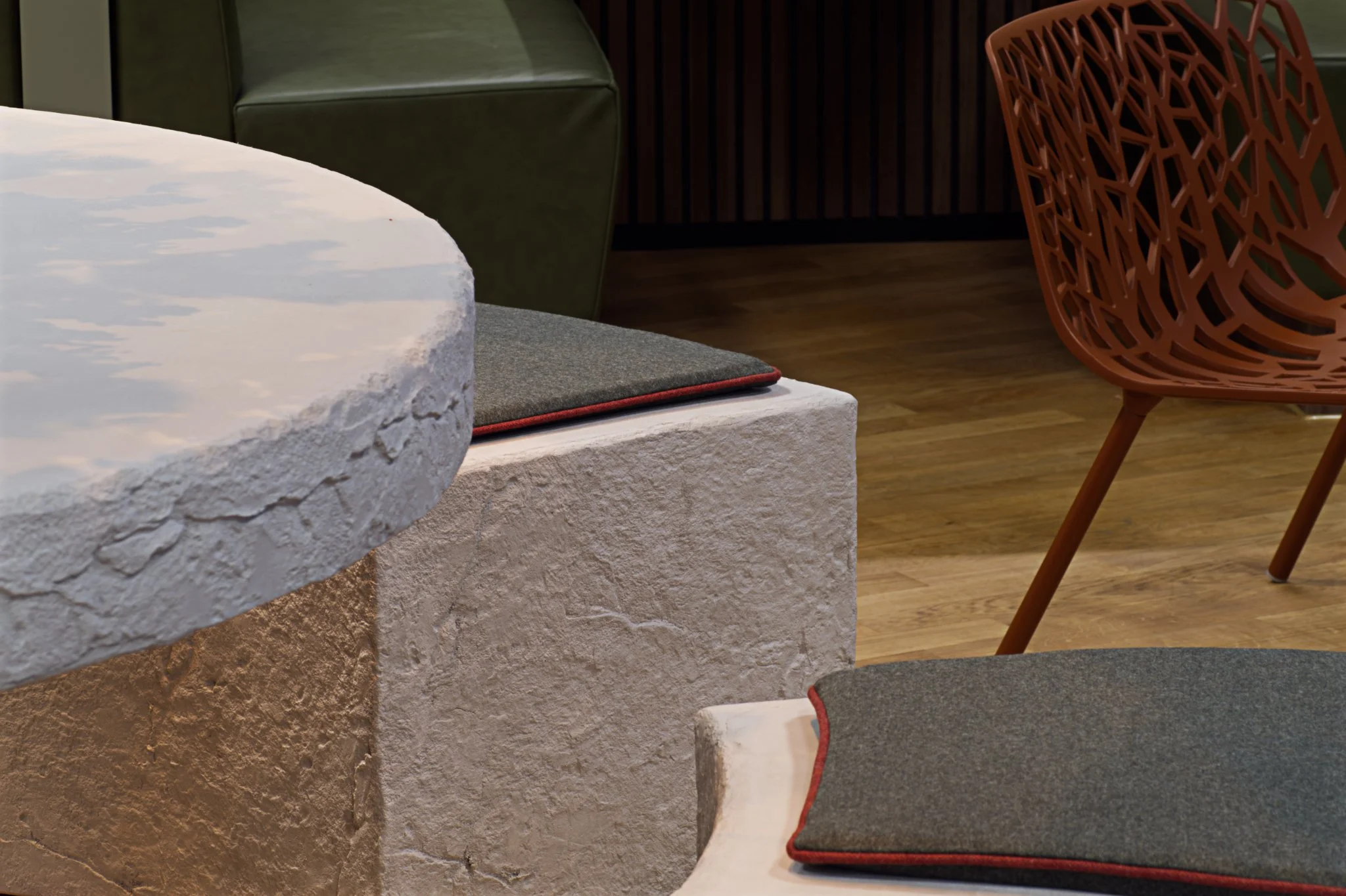 Neben der kulinarischen Nutzung dient der Raum als Treffpunkt für private Telefonate, geschäftliche Meetings oder als Rückzugsort zum Lesen. Klare Linien, natürliche Materialien und eine durchdachte Beleuchtung schaffen einen funktionalen und identitätsstiftenden Raum, der die Werte des Unternehmens widerspiegelt.