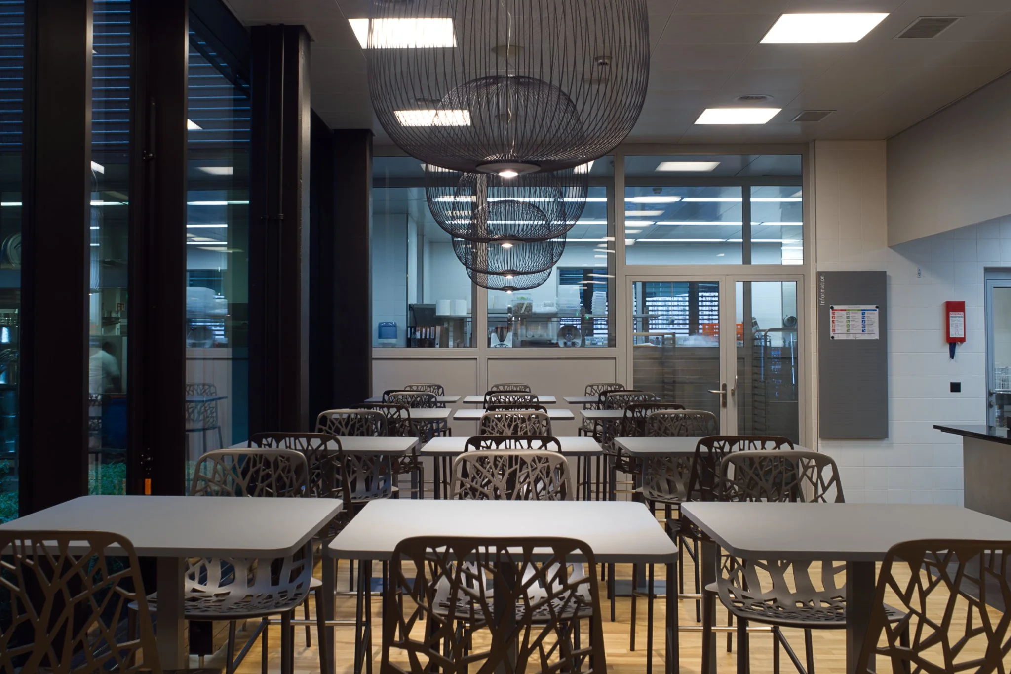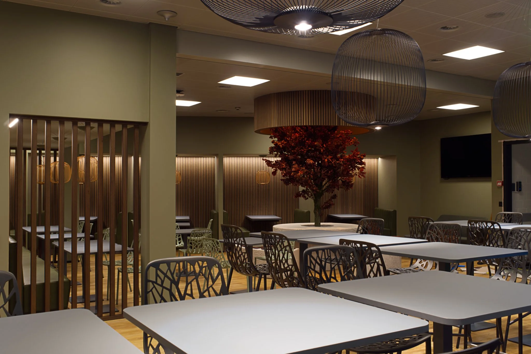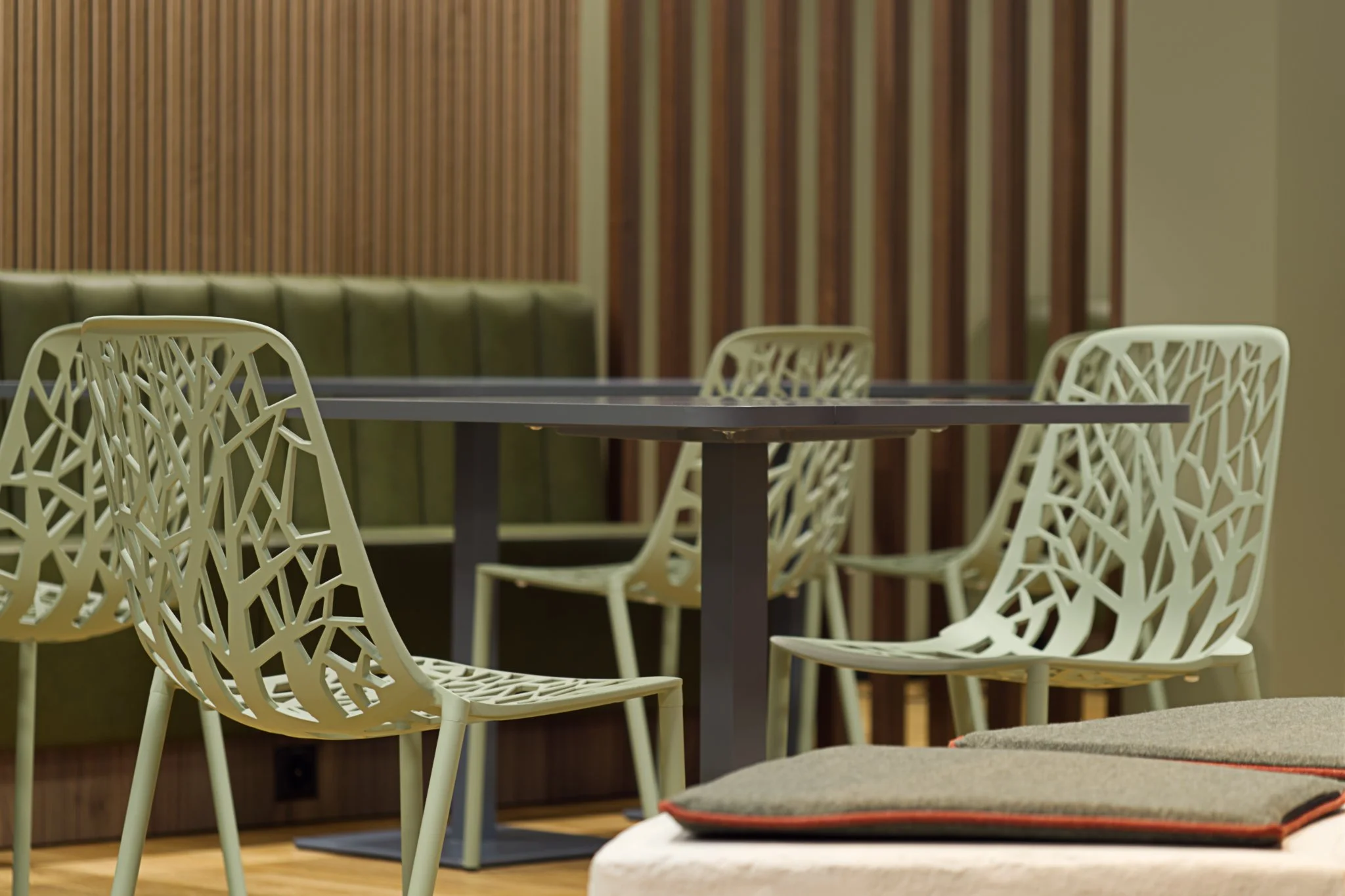 Bei der Planung wurde die dynamische Arbeitswelt ebenso berücksichtigt wie unterschiedliche Ernährungsgewohnheiten, bei denen oft schnelles, konzentriertes Essen notwendig ist. Gleichzeitig schafft der Raum Ruhe und Ausgleich, ohne durch zu viele optische Reize zu ermüden. Zudem sorgt er dafür, dass die Geräuschkulisse auch bei hoher Auslastung angenehm bleibt.