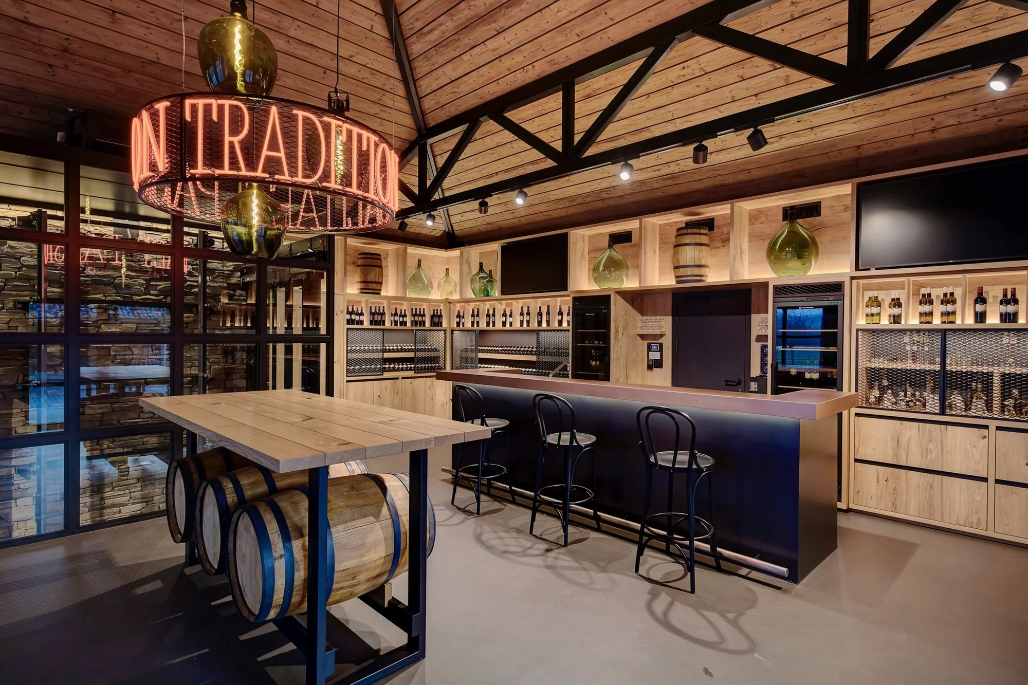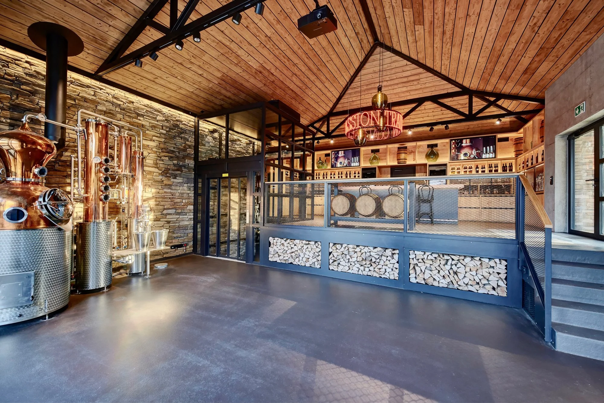 Das Konzept verbindet industrielle Materialien wie Kupfer, Stahl und schwarzes Streckmetall mit natürlichen Materialien wie Eichenholz, Glas und Stein. So entstehen harmonische, einladende Räume, in denen die Gäste die Destillation und Weinverkostung hautnah miterleben können.